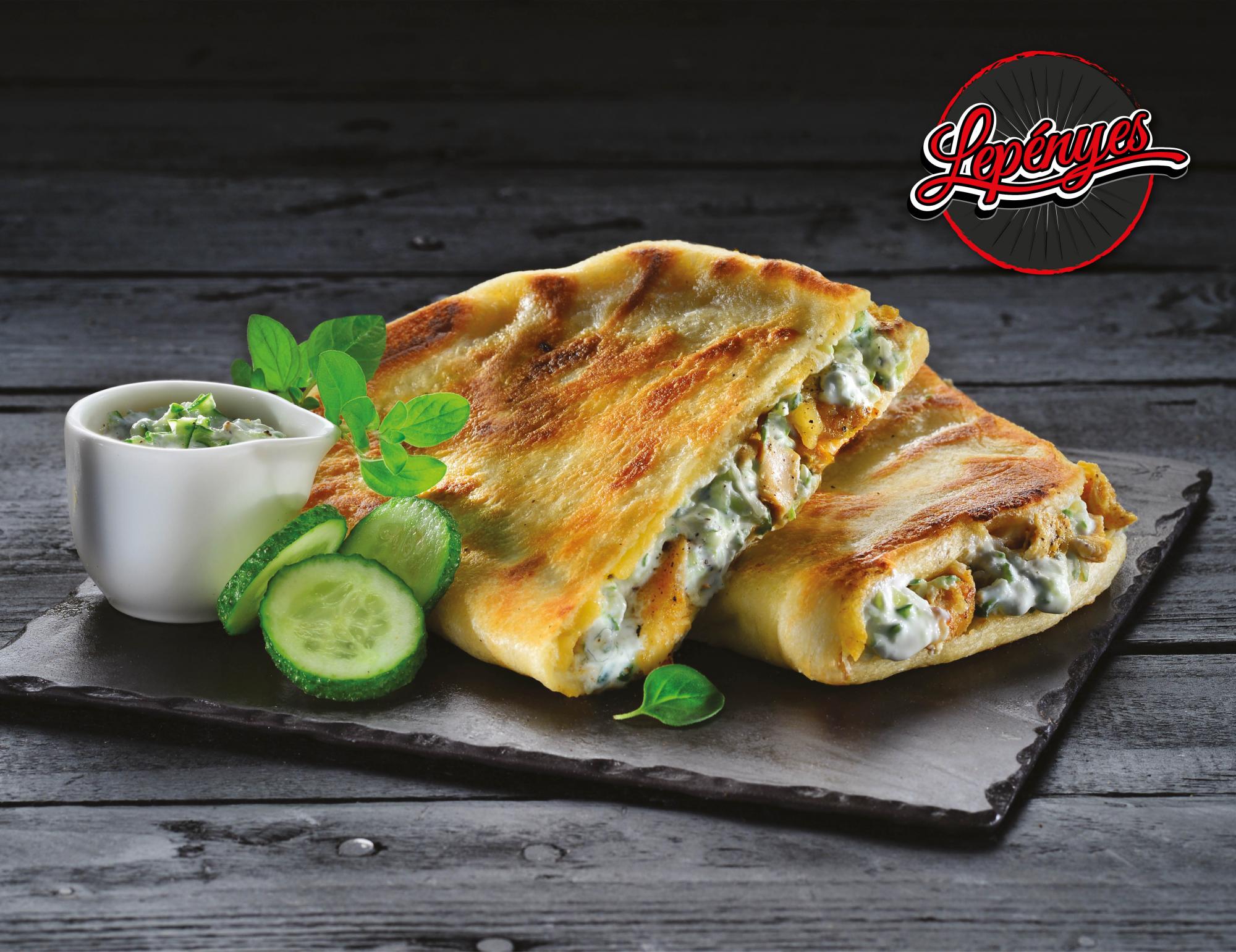 Kellemesen sült, mennyei illatú, rusztikus, kézzel nyújtott, kívül ropogós lepény görög fűszerezésű csirkemellel, tzatzikivel töltve.